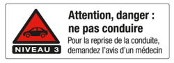 Les médicaments dits de niveau 3 sont signalés par un pictogramme sur fond rouge, avec les mentions « Niveau 3 », et « Attention, danger : ne pas conduire. Pour la reprise de la conduite, demandez l’avis d’un médecin. »